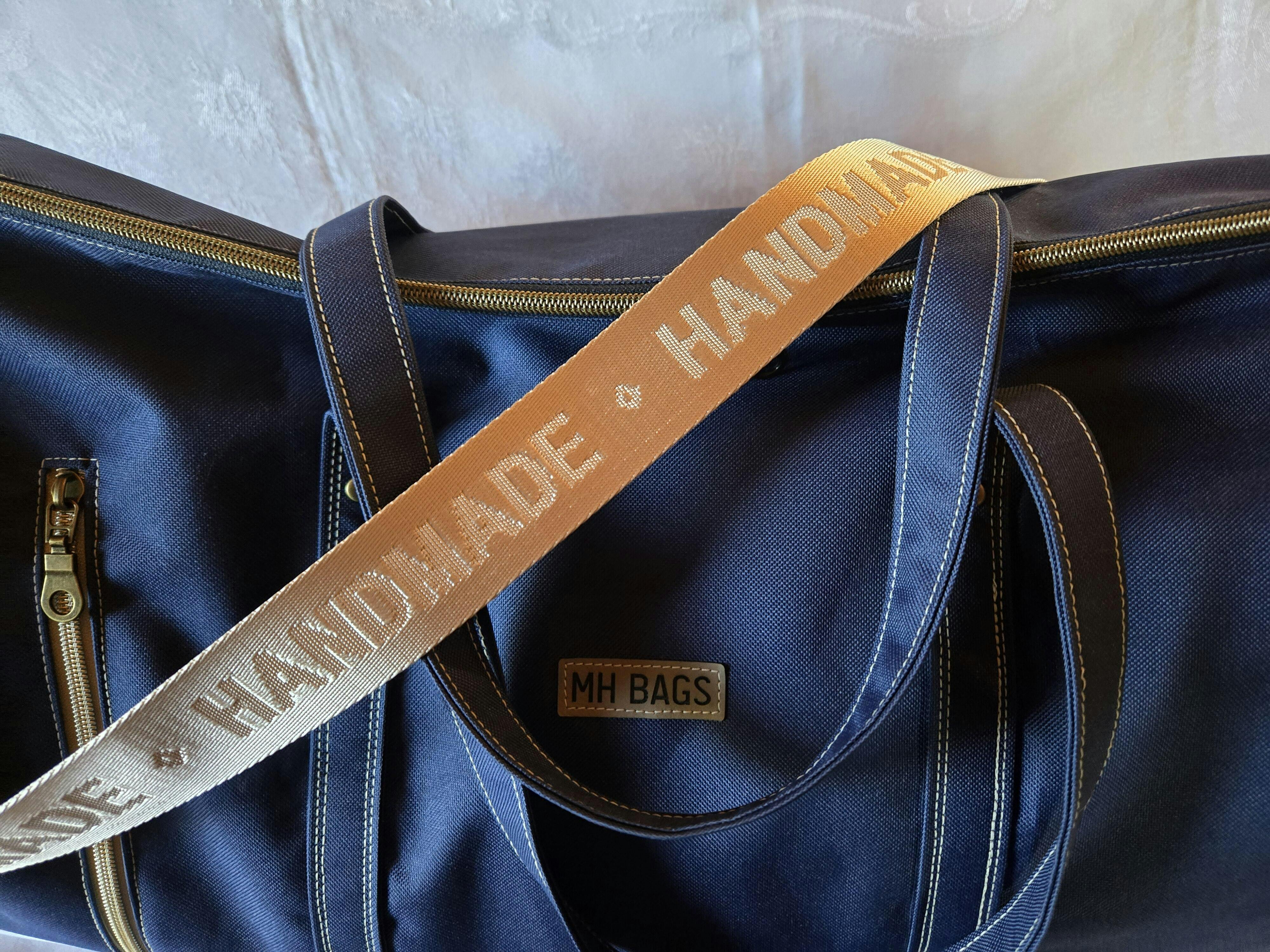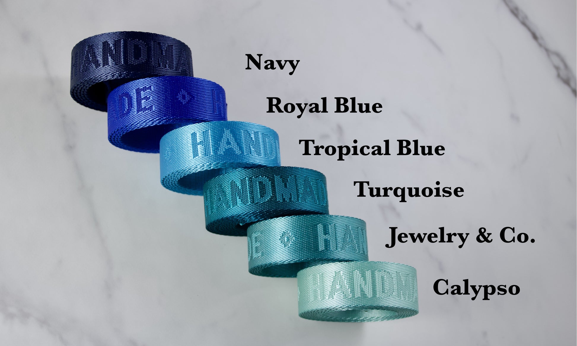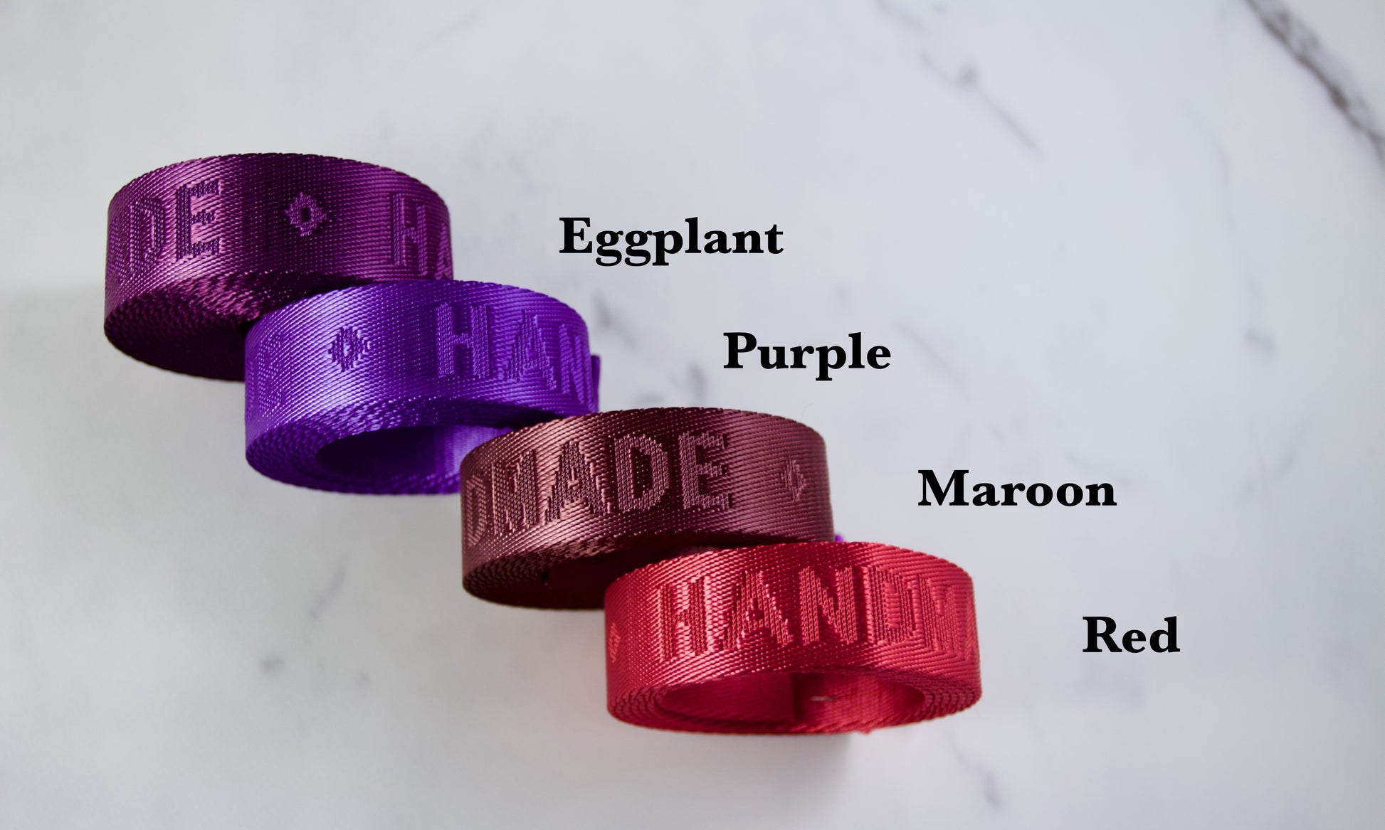 1" woven webbing, HANDMADE is woven directly into the webbing. IT IS NOT HOT STAMPED, DEBOSSED, OR EMBOSSED. IT IS WOVEN DIRECTLY INTO THE FIBERS OF THIS SOFT AND STABLE MATERIAL, MAKING IT THE HIGHEST QUALITY AND THE MOST LUXURIOUS IN BOTH LOOK AND FEEL. THERE IS NO COMPARISON.