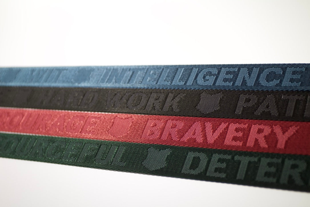 Brave house (maroon)- WEBBING READS: BRAVERY * CHIVALRY * NERVE * COURAGE *