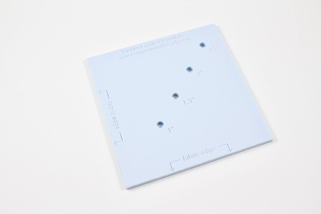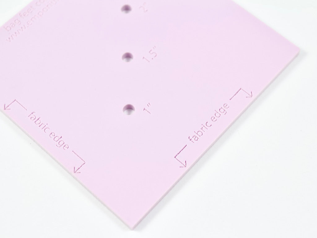 Simply line the template up to the corresponding fabric edges per to marking on the template. Mark your holes, punch your holes, then apply your bag feet consistently and fast! No more measuring and guesswork.