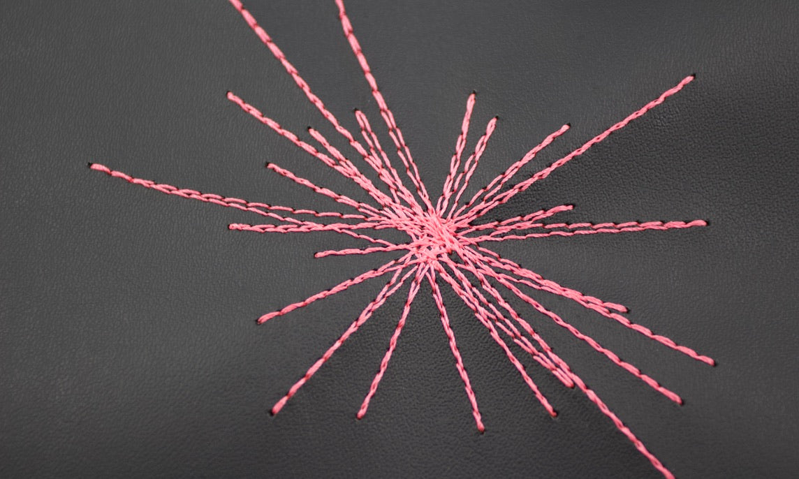 Thread color always appears more saturated/darker on the spool. See the stitched thread for best color interpretation. Stitched on matte black vinyl.