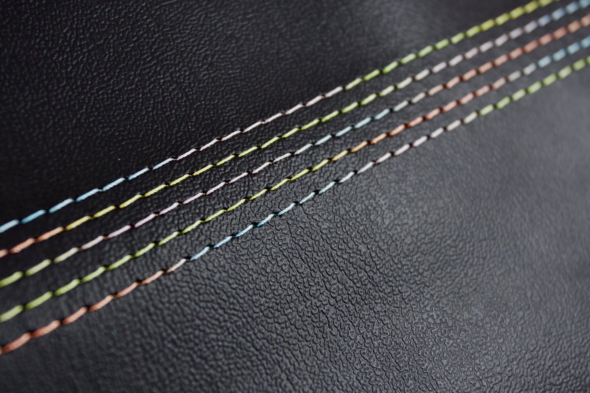 Thread color always appears more saturated/darker on the spool. See the stitched thread for best color interpretation. Stitched on matte black vinyl.